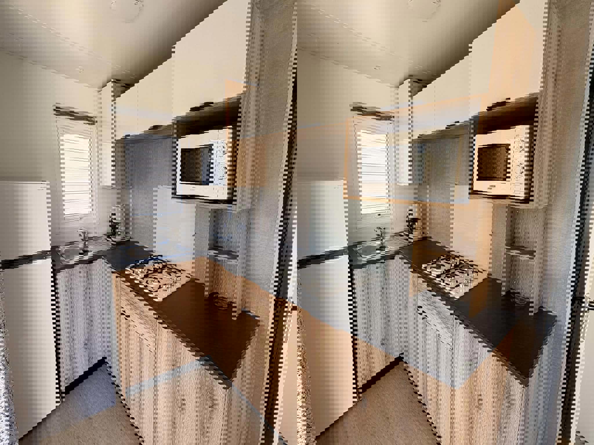 • Kitchen equipped with crockery, electric coffee maker, 4-burner gas hob, extractor hood, fridge-freezer, microwave, kettle.