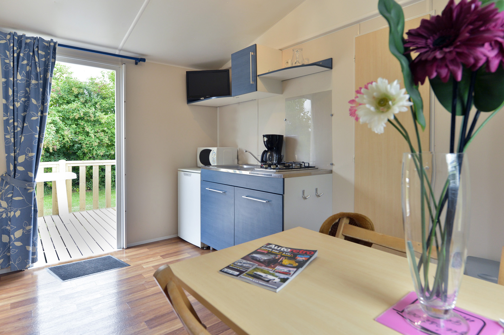 – Cuisine équipée de vaisselle, cafetière électrique, plaque de cuisson gaz à 2 feux, réfrigérateur, micro ondes, bouilloir