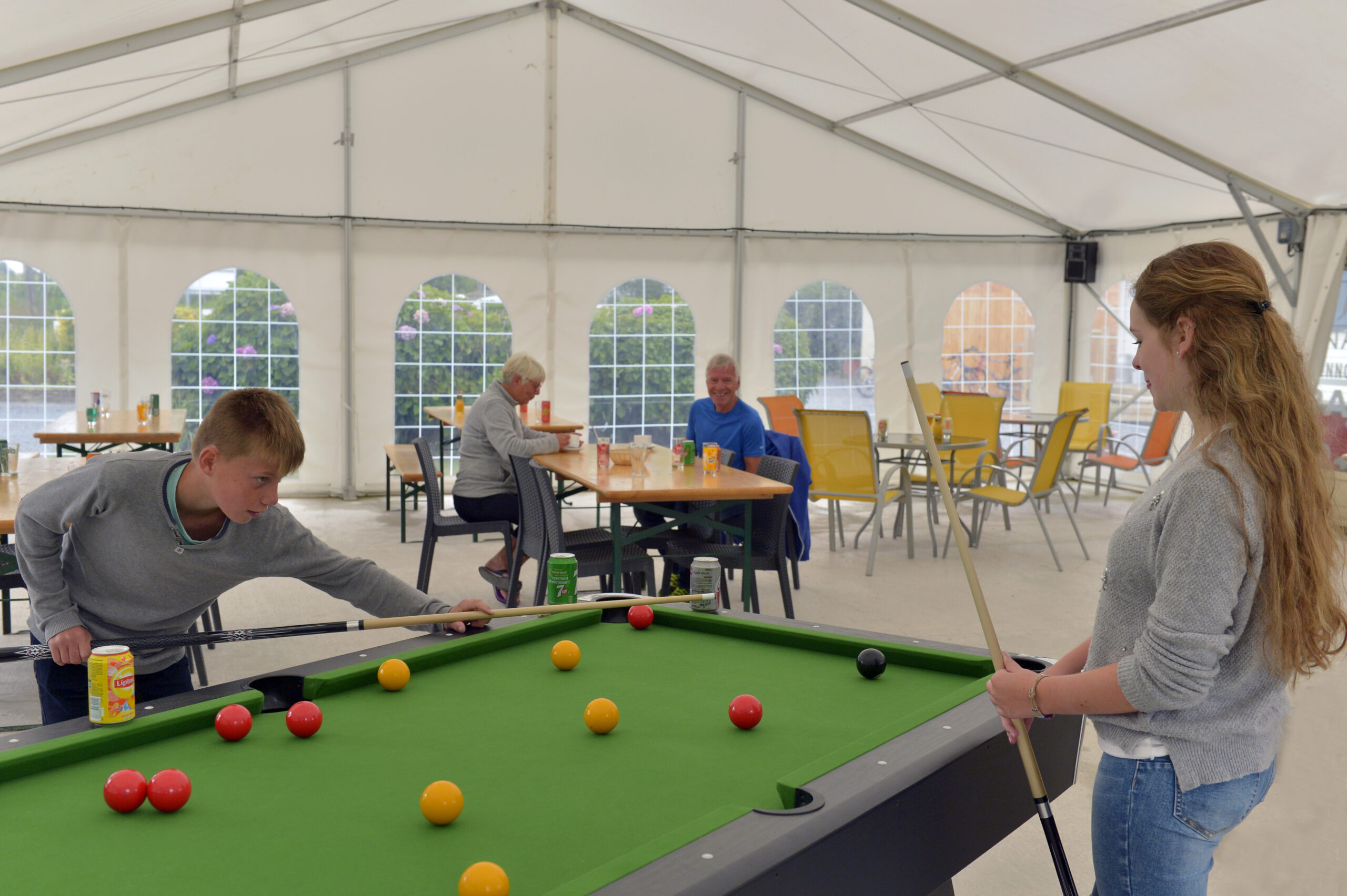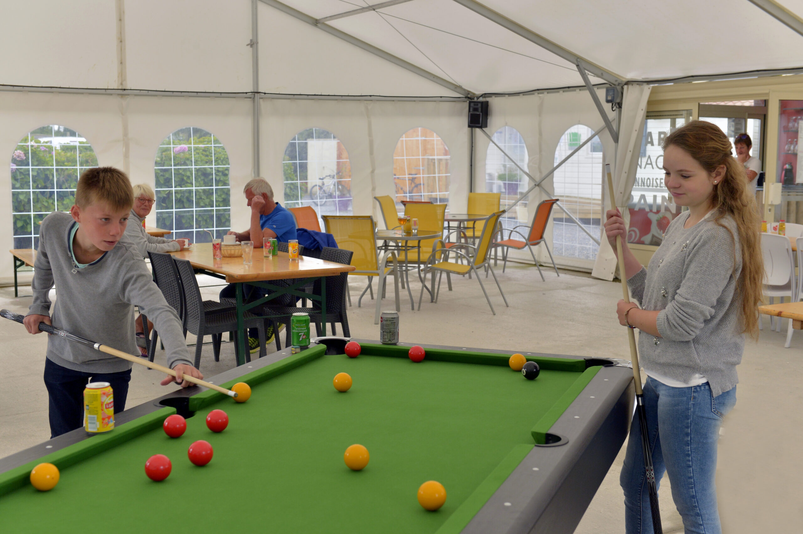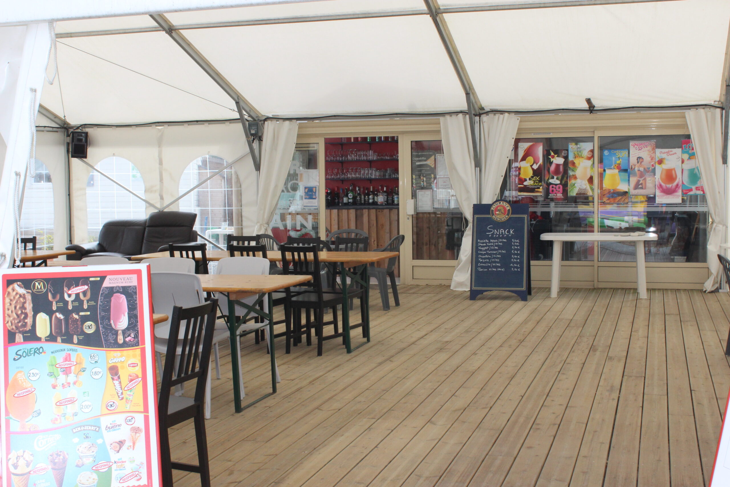 Côté bar, profitez d’un moment convivial autour d’un cocktail, d’une boisson fraîche ou d’une glace, en terrasse ou sous notre grand barnum de 120 m².