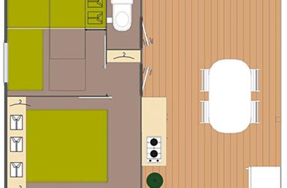 Avec ses 26 m², sa kitchenette donnant sur la terrasse en bois, son toilette et ses deux chambres confortables, le Tithome est ainsi une location de camping agréable et ressourçante. N’hésitez plus, et emmenez votre famille ou vos amis au camping Le Clos de Balleroy, près de Bayeux, dans le Tithome : vos souvenirs de vacances seront inoubliables.